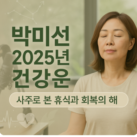 2025년은 박미선의 사주에 ‘편인’과 ‘겁재’가 들어오는 해입니다. 이는 육체적인 건강보다는 심리적 피로와 정신적 에너지 소모가 많아지는 시기로 해석됩니다. 바쁜 일정, 대인관계로 인한 부담 등이 누적되기 쉬운 시기인 만큼, 마음의 휴식이 매우 중요한 해입니다.