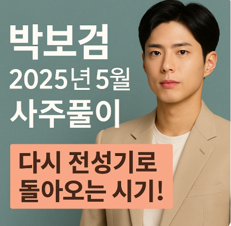 박보검은 2025년 5월, 새로운 인연과 재정비의 시기를 겪습니다. 이 시기 박보검은 업계 내 새로운 협업 파트너를 만나게 될 수 있으며, 과거 인연과의 관계도 자연스럽게 정리되거나 재정립될 수 있습니다. 박보검의 사주는 신뢰와 진정성에 기반한 관계를 선호하기 때문에, 이번 달은 더욱 깊은 유대감을 형성하는 데 유리한 시기입니다.