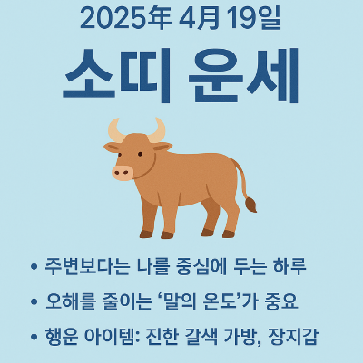 2025년 4월 19일, 소띠에게는 마음을 비우는 지혜가 필요한 하루입니다. 욕심을 부리기보다는 본인의 페이스를 유지하는 것이 더 좋은 결과를 부를 수 있습니다. 느긋하게 상황을 지켜보며, 필요한 행동만 선택적으로 하는 것이 핵심입니다.